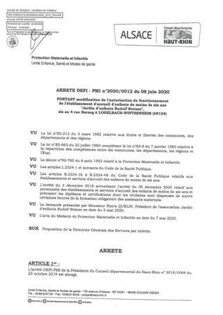 portant modification de l'autorisation de fonctionnement de l'établissement d'accueil d'enfants de moins de six ans "Jardin d'enfants Rudolf Steiner", sis au 4 rue Herzog à LOGELBACH-WINTZENHEIM (68124) Resumé Pièces jointes ARRETE Assemblée : Non défini Date : 08/06/2020 Rapporteur : Non défini Collectivité : Conseil départemental du Haut-Rhin Direction : Non défini Service : Direction Enfance Famille Insertion Domaine : Accueil d'enfants Commission :