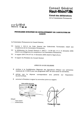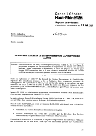 Dans le cadre du BP 2007, un crédit prévisionnel de 15.000 € a été inscrit pour le programme européen de développement de l’apiculture en Alsace sous diverses réserves. Après complément d’information, il vous est proposé de retenir pour l'année 2007 les actions liées à la lutte contre la varroatose, maladie de l’abeille mellifère causée par un parasite, pour un montant total de 14.000 €.