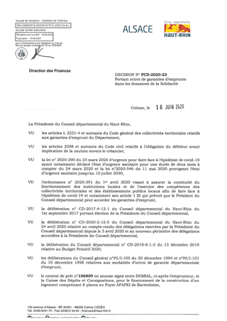 portant octroi de garanties d'emprunts dans les domaines de la Solidarité Resumé Pièces jointes ARRETE Assemblée : Non défini Date : 12/06/2020 Rapporteur : Non défini Collectivité : Conseil départemental du Haut-Rhin Direction : Non défini Service : Direction des Finances Domaine : Autres (non classés) Commission :
