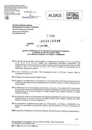 portant notification de la décision d'autorisation budgétaire et fixation du prix de journée 2020 de la maison d'enfants "Le Chalet" à RIMBACH Resumé Pièces jointes ARRETE Assemblée : Non défini Date : 17/06/2020 Rapporteur : Non défini Collectivité : Conseil départemental du Haut-Rhin Direction : Non défini Service : Direction Ressources Solidarité Domaine : Prix de Journée Commission :