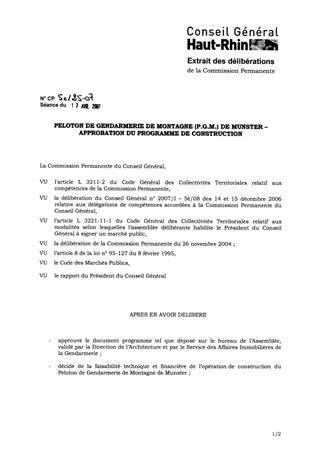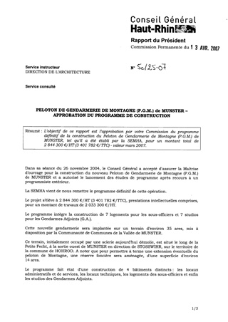 L’objectif de ce rapport est l’approbation par votre Commission du programme définitif de la construction du Peloton de Gendarmerie de Montagne (P.G.M.) de MUNSTER, tel qu’il a été établi par la SEMHA, pour un montant total de 2 844 300 €/HT (3 401 782 €/TTC) - valeur mars 2007.
