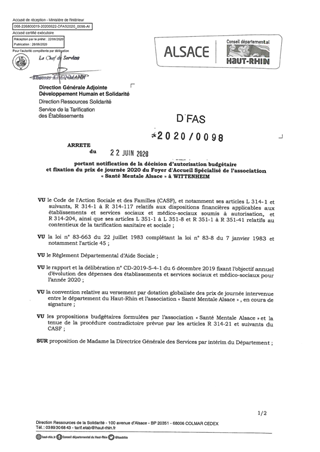 portant notification de la décision d'autorisation budgétaire et fixation du prix de journée 2020 du foyer d'accueil spécialisé de l'association "Santé Mentale Alsace" à WITTENHEIM Resumé Pièces jointes ARRETE Assemblée : Non défini Date : 22/06/2020 Rapporteur : Non défini Collectivité : Conseil départemental du Haut-Rhin Direction : Non défini Service : Direction Ressources Solidarité Domaine : Prix de Journée Commission :
