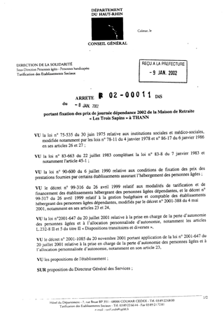 Portant fixation des prix de journée dépendance 2002 de la Maison de Retraite "Les Trois Sapins" à THANN Resumé Pièces jointes ARRETE Assemblée : Non défini Date : 08/01/2002 Rapporteur : Non défini Collectivité : Conseil départemental du Haut-Rhin Direction : Non défini Service : Direction de la Solidarité Domaine : Prix de Journée Commission :