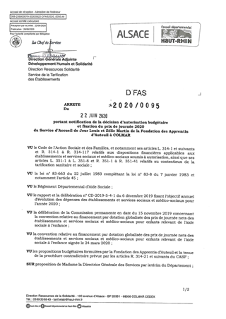 portant notification de la décision d'autorisation budgétaire et fixation du prix de journée 2020 du service d'accueil de jour Louis et Zélie Martin de la fondation des apprentis d'Auteuil à COLMAR Resumé Pièces jointes ARRETE Assemblée : Non défini Date : 22/06/2020 Rapporteur : Non défini Collectivité : Conseil départemental du Haut-Rhin Direction : Non défini Service : Direction Ressources Solidarité Domaine : Prix de Journée Commission :