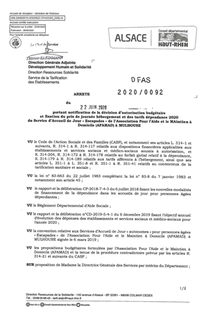 portant notification de la décision d'autorisation budgétaire et fixation du prix de journée hébergement et des tarifs dépendance 2020 du service d'accueil de jour "Escapades" de l'association pour l'aide et le maintien à domicile (APAMAD) à MULHOUSE