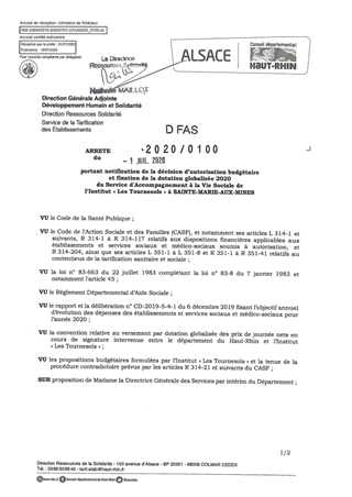 portant notification de la décision d'autorisation budgétaire et fixation de la dotation globalisée 2020 du service d'accompagnement à la vie sociale de l'Institut "Les Tournesols" à SAINTE MARIE AUX MINES Resumé Pièces jointes ARRETE Assemblée : Non défini Date : 01/07/2020 Rapporteur : Non défini Collectivité : Conseil départemental du Haut-Rhin Direction : Non défini Service : Direction Ressources Solidarité Domaine : Dotations financières Commission :