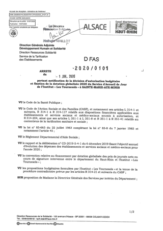 portant notification de la décision d'autorisation budgétaire et fixation de la dotation globalisée 2020 du service d'accueil de jour de l'Institut "Les Tournesols" à SAINTE MARIE AUX MINES Resumé Pièces jointes ARRETE Assemblée : Non défini Date : 01/07/2020 Rapporteur : Non défini Collectivité : Conseil départemental du Haut-Rhin Direction : Non défini Service : Direction Ressources Solidarité Domaine : Dotations financières Commission :