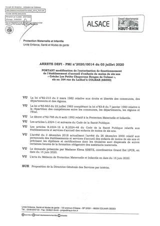 portant modification de l'autorisation de fonctionnement de l'établissement d'accueil d'enfants de moins de six ans « Crèche Les Petits Chaperons Rouges de Colmar », sis au 164 rue du Ladhof à COLMAR (68000) Resumé Pièces jointes ARRETE Assemblée : Non défini Date : 03/07/2020 Rapporteur : Non défini Collectivité : Conseil départemental du Haut-Rhin Direction : Non défini Service : Direction Enfance Famille Insertion Domaine : Accueil d'enfants Commission :