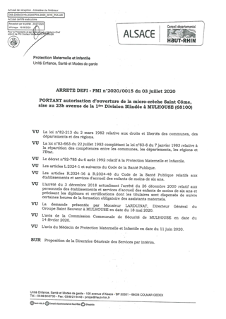 portant autorisation d'ouverture de la micro-crèche Saint-Côme, sise au 23b avenue de la 1ère Division Blindée à MULHOUSE (68100) Resumé Pièces jointes ARRETE Assemblée : Non défini Date : 03/07/2020 Rapporteur : Non défini Collectivité : Conseil départemental du Haut-Rhin Direction : Non défini Service : Direction Enfance Famille Insertion Domaine : Accueil d'enfants Commission :