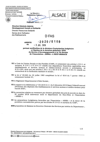 portant notification de la décision d'autorisation budgétaire et fixation de la dotation globalisée 2020 du service d'accompagnement à la vie sociale de l'association "ARSEA" à NEUF BRISACH Resumé Pièces jointes ARRETE Assemblée : Non défini Date : 03/07/2020 Rapporteur : Non défini Collectivité : Conseil départemental du Haut-Rhin Direction : Non défini Service : Direction Ressources Solidarité Domaine : Dotations financières Commission :
