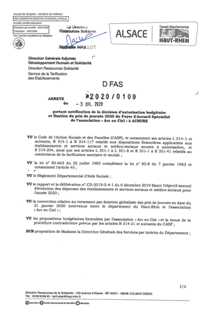 portant notification de la décision d'autorisation budgétaire et fixation du prix de journée 2020 du foyer d'accueil spécialisé de l'association "Arc en Ciel" à AUBURE Resumé Pièces jointes ARRETE Assemblée : Non défini Date : 03/07/2020 Rapporteur : Non défini Collectivité : Conseil départemental du Haut-Rhin Direction : Non défini Service : Direction Ressources Solidarité Domaine : Prix de Journée Commission :
