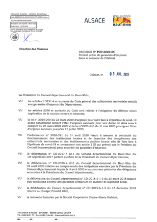 portant octroi de garanties d'emprunt dans le domaine de l'Habitat Resumé Pièces jointes ARRETE Assemblée : Non défini Date : 03/07/2020 Rapporteur : Non défini Collectivité : Conseil départemental du Haut-Rhin Direction : Non défini Service : Direction des Finances Domaine : Autres (non classés) Commission :