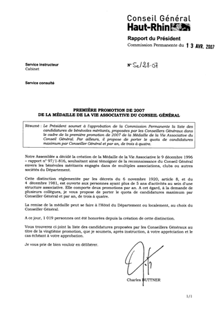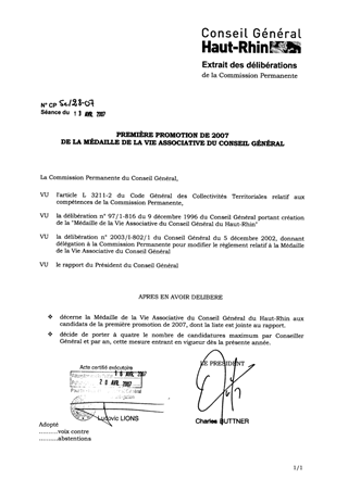 Le Président soumet à l'approbation de la Commission Permanente la liste des candidatures de bénévoles méritants, proposées par les Conseillers Généraux dans le cadre de la première promotion de 2007 de la Médaille de la Vie Associative du Conseil Général. Par ailleurs, il propose de porter le quota de candidatures maximum par Conseiller Général et par an, de trois à quatre.