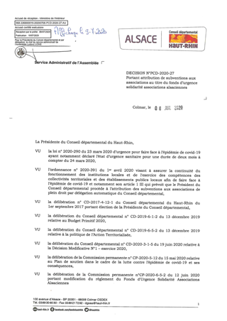 portant attribution de subventions aux associations au titre du fonds d'urgence solidarité associations alsaciennes Resumé Pièces jointes ARRETE Assemblée : Non défini Date : 08/07/2020 Rapporteur : Non défini Collectivité : Conseil départemental du Haut-Rhin Direction : Non défini Service : Direction d'Appuis Juridique et Documentaire Domaine : Autres (non classés) Commission :