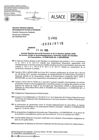 portant fixation des tarifs horaires et de la dotation globale 2020 du service d'aide et d'accompagnement à domicile auprès des familles de l'association "A DOM'AIDE 68" à MULHOUSE Resumé Pièces jointes ARRETE Assemblée : Non défini Date : 24/07/2020 Rapporteur : Non défini Collectivité : Conseil départemental du Haut-Rhin Direction : Non défini Service : Direction Ressources Solidarité Domaine : Dotations financières Commission :