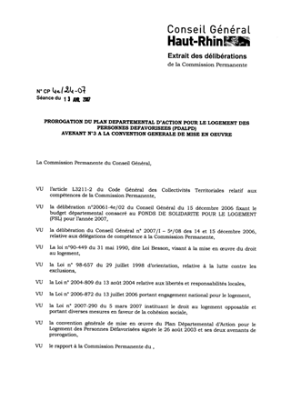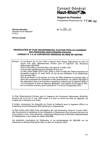 La Loi Besson du 31 mai 1990 a instauré dans chaque Département la mise en œuvre d’un Plan Départemental d’Action pour le Logement des Personnes Défavorisées (PDALPD). Dans le Haut-Rhin, le premier plan a été signé le 4 Juillet 1991. Il est prorogé régulièrement par périodes de trois ans. Le Plan actuel (juillet 2003 à juin 2006) a d’ores et déjà fait l’objet d’avenants de prorogation jusqu’au 31 mars 2007, en vue de son évaluation et de l’élaboration d’un nouveau Plan. Afin de permettre à nos services et ceux de l’Etat d’élaborer le prochain Plan, à partir des conclusions de l’évaluation et des préconisations du Cabinet SQUARE et des dispositions liées à la loi portant engagement national pour le logement (ENL) et à la loi instituant le droit au logement opposable, il est proposé de proroger le Plan, par un troisième avenant, pour la période du 1er avril au 30 septembre 2007.