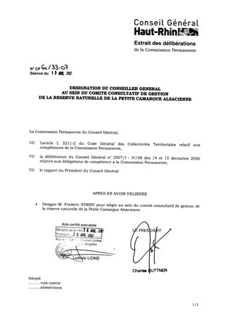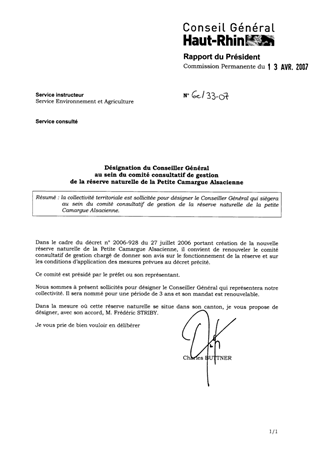 la collectivité territoriale est sollicitée pour désigner le Conseiller Général qui siègera au sein du comité consultatif de gestion de la réserve naturelle de la petite Camargue Alsacienne.