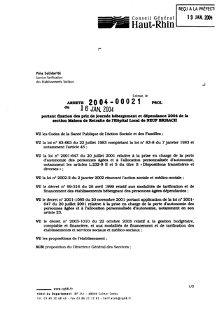 portant fixation des prix de journée hébergement et dépendance 2004 de la section maison de retraite de l'hôpital local de NEUF BRISACH. Resumé Pièces jointes ARRETE Assemblée : Non défini Date : 16/01/2004 Rapporteur : Non défini Collectivité : Conseil départemental du Haut-Rhin Direction : Non défini Service : Service de la Tarification des Etablissements Domaine : Prix de Journée Commission :