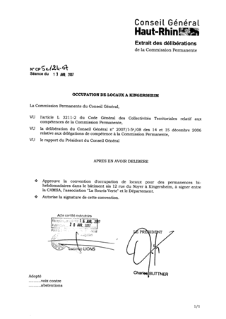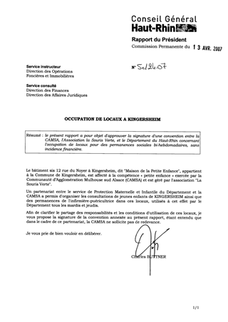 le présent rapport a pour objet d'approuver la signature d'une convention entre la CAMSA, l'Association la Souris Verte, et le Département du Haut-Rhin concernant l'occupation de locaux pour des permanences sociales bi-hebdomadaires, sans incidence financière.