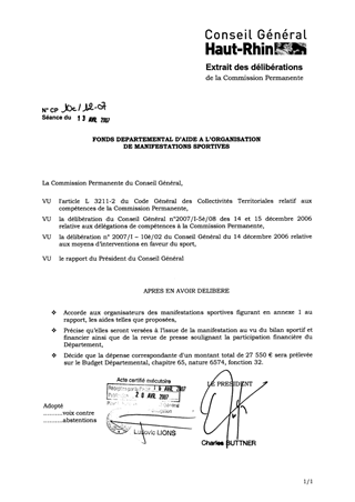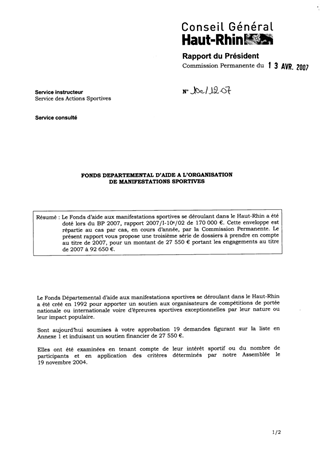 Le Fonds d’aide aux manifestations sportives se déroulant dans le Haut-Rhin a été doté lors du BP 2007, rapport 2007/I-10e/02 de 170 000 €. Cette enveloppe est répartie au cas par cas, en cours d’année, par la Commission Permanente. Le présent rapport vous propose une troisième série de dossiers à prendre en compte au titre de 2007, pour un montant de 27 550 € portant les engagements au titre de 2007 à 92 650 €.