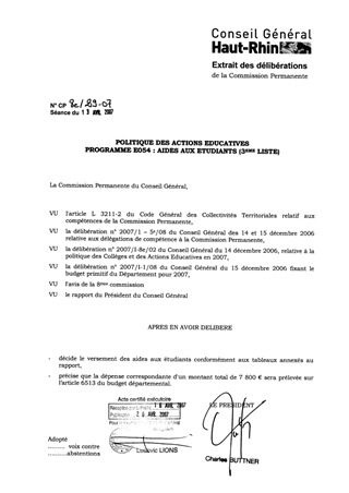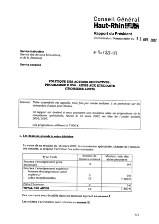 Notre assemblée est appelée, trois fois par année scolaire, à se prononcer sur les demandes d'aides pour études. Ce rapport est destiné à vous soumettre une troisième série de propositions de la commission spécialisée, réunie le 16 mars 2007, au titre de l'année scolaire 2006/2007. Ces propositions s'élèvent à 7 800 €.