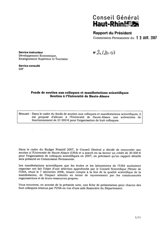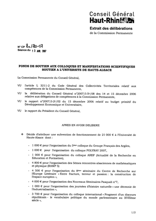 Dans le cadre du fonds de soutien aux colloques et manifestations scientifiques, il est proposé d’allouer à l’Université de Haute-Alsace une subvention de fonctionnement de 21 000 € pour l’organisation de huit colloques.