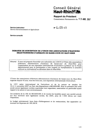 Demande de subvention de l'union des associations d'éleveurs sélectionneurs d'animaux de basse-cour du Haut-Rhin