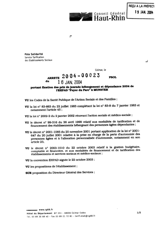 portant fixation des prix de journée hébergement et dépendance 2004 de l'EHPAD "Foyer du Parc" à MUNSTER. Resumé Pièces jointes ARRETE Assemblée : Non défini Date : 16/01/2004 Rapporteur : Non défini Collectivité : Conseil départemental du Haut-Rhin Direction : Non défini Service : Service de la Tarification des Etablissements Domaine : Prix de Journée Commission :