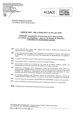 portant autorisation d'ouverture de la micro-crèche "La Colline aux Papillons", sise au 15 avenue de Bruxelles à BRUNSTATT-DIDENHEIM (68350) Resumé Pièces jointes ARRETE Assemblée : Non défini Date : 04/08/2020 Rapporteur : Non défini Collectivité : Conseil départemental du Haut-Rhin Direction : Non défini Service : Direction Enfance Famille Insertion Domaine : Accueil d'enfants Commission :