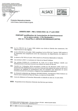 portant modification de l'autorisation de fonctionnement de la micro-crèche "L'Ile Enchantée", sise au 1 Grand'Rue à ASPACH-MICHELBACH (68700) Resumé Pièces jointes ARRETE Assemblée : Non défini Date : 17/08/2020 Rapporteur : Non défini Collectivité : Conseil départemental du Haut-Rhin Direction : Non défini Service : Direction Enfance Famille Insertion Domaine : Accueil d'enfants Commission :