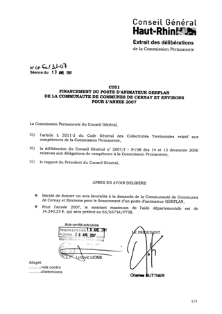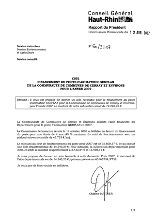 Il vous est proposé de donner un avis favorable pour le financement du poste d'animateur GERPLAN pour la Communauté de Communes de Cernay et Environs, pour l’année 2007. Le montant de notre subvention serait de 14.240,23 €.