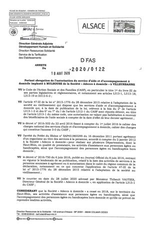 portant abrogation de l'autorisation du service d'aide et d'accompagnement à domicile implanté à MULHOUSE de la société "Adecco à domicile" à VILLEURBANNE Resumé Pièces jointes ARRETE Assemblée : Non défini Date : 18/08/2020 Rapporteur : Non défini Collectivité : Conseil départemental du Haut-Rhin Direction : Non défini Service : Direction Ressources Solidarité Domaine : Autres (non classés) Commission :