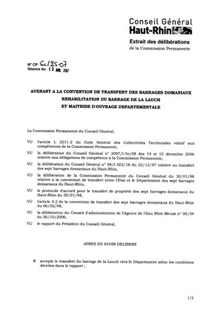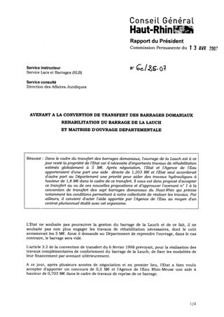 Dans le cadre du transfert des barrages domaniaux, l'ouvrage de la Lauch est à ce jour resté la propriété de l'Etat car il nécessite d'importants travaux de réhabilitation estimés globalement à 5 M€. Après négociation, l'Etat et l'Agence de l'Eau apporteraient d'une part une aide directe de 1,203 M€ et l'Etat seul accorderait d'autre part au Département une priorité pour aider des travaux hydrauliques à hauteur de 1,8 M€ dans le cadre de ce transfert. Il vous est donc proposé d'accepter ce transfert au vu de ces nouvelles propositions et d’approuver l'avenant n° 1 à la convention de transfert des sept barrages domaniaux du Haut-Rhin qui précise notamment les conditions permettant à notre collectivité de réaliser les travaux. Par ailleurs, il convient d'acter l'aide apportée par l'Agence de l'Eau au moyen d'un contrat pluriannuel établi avec cet organisme.