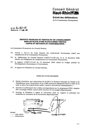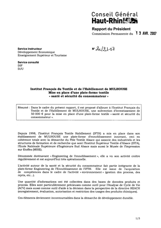 Dans le cadre du présent rapport, il est proposé d’allouer à l’Institut Français du Textile et de l’Habillement de MULHOUSE, une subvention d’investissement de 50 000 € pour la mise en place d’une plate-forme textile « santé et sécurité du consommateur ».