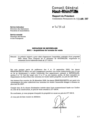 Le présent rapport a pour objet d'approuver l'acquisition anticipée d'une propriété bâtie située dans l'emprise de la Déviation de RETZWILLER, moyennant le versement d'une indemnité totale de 277 000 €.