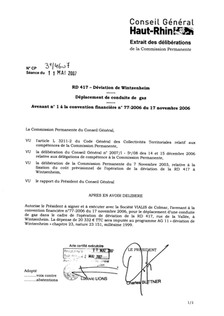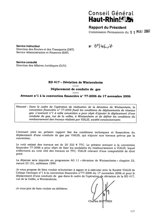RD 417 - Déviation de Wintzenheim : Déplacement de conduite de gaz : Avenant n°1 à la convention financière n°77-2006 du 17 novembre 2006