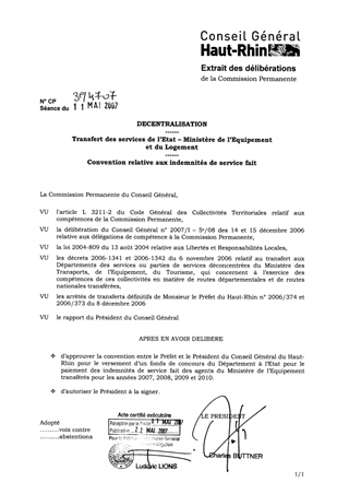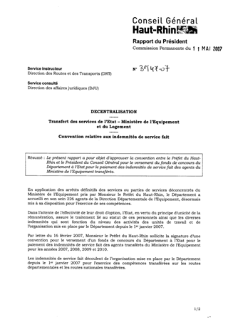 Le présent rapport a pour objet d’approuver la convention entre le Préfet du Haut-Rhin et le Président du Conseil Général pour le versement du fonds de concours du Département à l’Etat pour le paiement des indemnités de service fait des agents du Ministère de l’Equipement transférés.