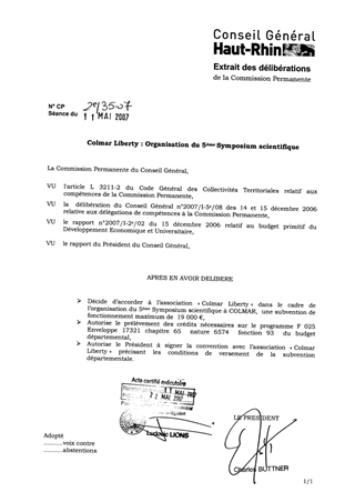 Il est proposé d’allouer à « Colmar Liberty » une subvention de fonctionnement de 19 000 € dans le cadre de l’organisation du 5ème Symposium scientifique.