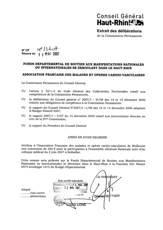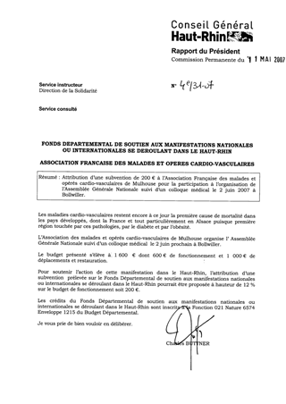 Attribution d’une subvention de 200 € à l’Association Française des malades et opérés cardio-vasculaires de Mulhouse pour la participation à l’organisation de l’Assemblée Générale Nationale suivi d’un colloque médical le 2 juin 2007 à Bollwiller
