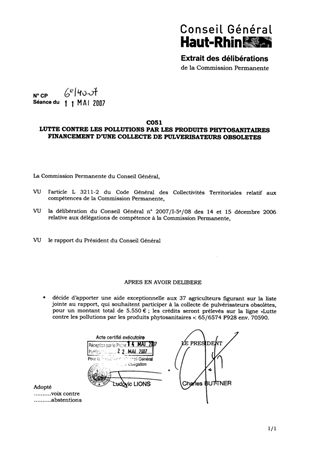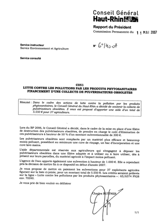 Dans le cadre des actions de lutte contre la pollution par les produits phytosanitaires, le Conseil Général du Haut-Rhin a décidé de soutenir la collecte de pulvérisateurs obsolètes. Il vous est proposé d’apporter une aide d’un total de 5.550 € pour 37 agriculteurs.