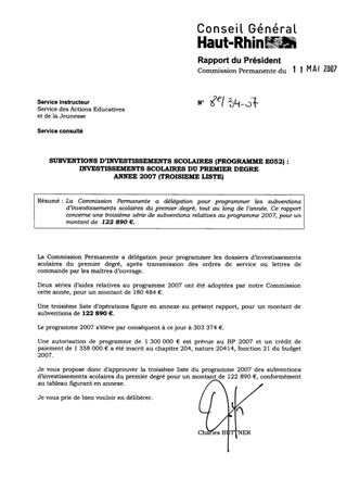 Subventions d'investissements scolaires (programme E052) : Investissements scolaires du premier degré année 2007 (troisième liste)