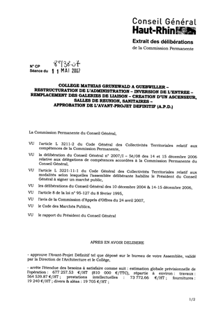Collège Mathias Grunenwald à Guebwiller : restructuration de l'administration - Inversion de l'entrée - Remplacement des galeries de liaison - création d'un ascenseur, de salles de réunion, de sanitaires - Approbation de l'avant projet définitif (A.P.D)