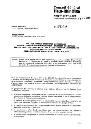 L’objet de ce rapport est de faire approuver par votre Assemblée l’Avant-Projet Définitif (A.P.D.) déposé par le Cabinet d’Architectes Echo Architecture de Colmar, pour un montant de travaux de 564 539,87 €/HT (valeur mars 2007), afin de lui permettre de poursuivre sa mission au stade de la phase Projet.