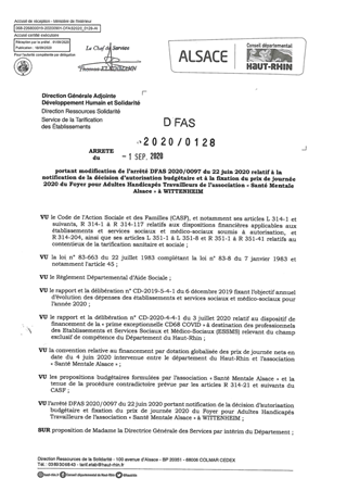 portant modification de l'arrêté DFAS 2020-0097 du 22.06.2020 relatif à la notification de la décision d'autorisation budgétaire et à la fixation du prix de journée 2020 du foyer pour adultes handicapés travailleurs de l'association "Santé Mentale Alsace"