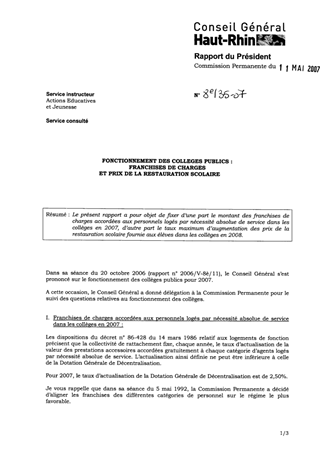Le présent rapport a pour objet de fixer d’une part le montant des franchises de charges accordées aux personnels logés par nécessité absolue de service dans les collèges en 2007, d’autre part le taux maximum d’augmentation des prix de la restauration scolaire fournie aux élèves dans les collèges en 2008.