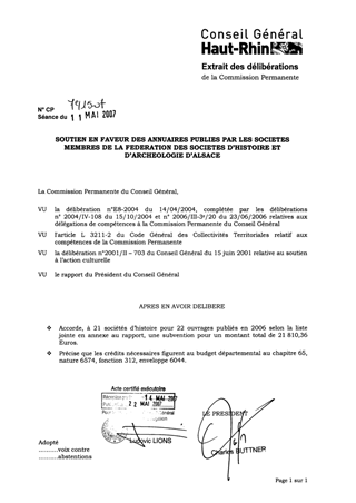 Un crédit de 30 000 € a été inscrit au Budget Primitif en faveur du soutien des publications des Sociétés d’Histoire. Il vous est proposé de vous prononcer sur l’octroi de cette aide aux 21 sociétés (pour 22 ouvrages) ayant publié en 2006, selon la liste jointe en annexe au rapport
