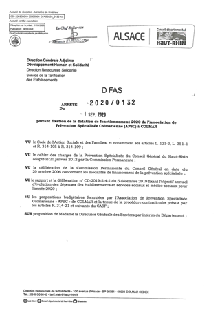 portant fixation de la dotation de fonctionnement 2020 de l'association de prévention spécialisée Colmarienne (APSC) à COLMAR Resumé Pièces jointes ARRETE Assemblée : Non défini Date : 01/09/2020 Rapporteur : Non défini Collectivité : Conseil départemental du Haut-Rhin Direction : Non défini Service : Direction Ressources Solidarité Domaine : Dotations financières Commission :