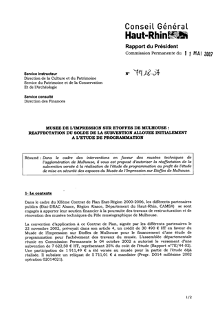 Dans le cadre des interventions en faveur des musées techniques de l’agglomération de Mulhouse, il vous est proposé d’autoriser la réaffectation de la subvention versée à la réalisation de l’étude de programmation au profit de l’étude de mise en sécurité des espaces du Musée de l’Impression sur Etoffes de Mulhouse.