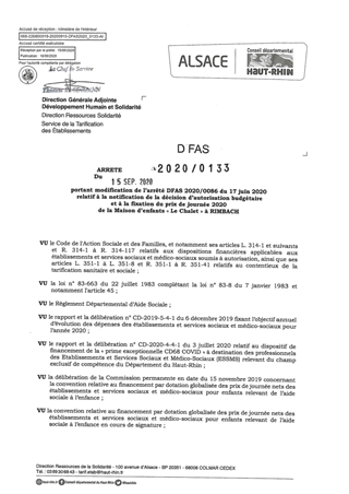 portant modification de l'arrêté DFAS 2020-0086 du 17.06.2020 relatif à la notification de la décision d'autorisation budgétaire et à la fixation du prix de journée 2020 de la Maison d'Enfants "Le Chalet" à RIMBACH Resumé Pièces jointes ARRETE Assemblée : Non défini Date : 15/09/2020 Rapporteur : Non défini Collectivité : Conseil départemental du Haut-Rhin Direction : Non défini Service : Direction Ressources Solidarité Domaine : Prix de Journée Commission :