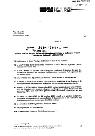 portant fixation des prix de journée dépendance 2004 de la maison de retraite "Le Parc des Salines II" à MULHOUSE. Resumé Pièces jointes ARRETE Assemblée : Non défini Date : 30/01/2004 Rapporteur : Non défini Collectivité : Conseil départemental du Haut-Rhin Direction : Non défini Service : Service de la Tarification des Etablissements Domaine : Prix de Journée Commission :